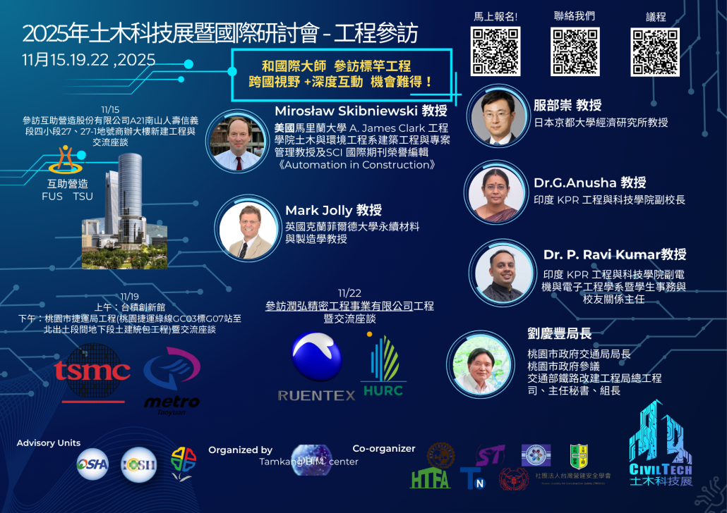 【轉知】淡江大學工學院工程資訊模擬與管理研究中心(BIM中心)訂於114年11月15日至22日期間舉辦「工程參訪」活動