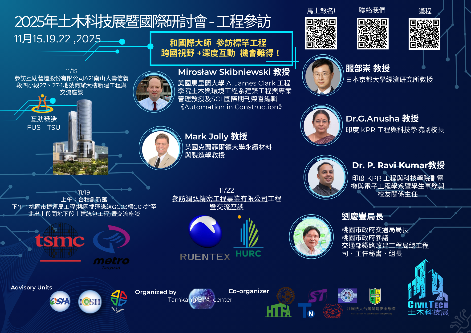 一、淡江大學工學院工程資訊模擬與管理研究中心(BIM中心)主辦之「2025土木科技展暨國際研討會」系列活動之一,與5名國際大師參與3場工程參訪,深入了解臺灣工程的實力: